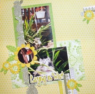 I looked through my stacks looking for something cheerful and happily selected the Lemon Flower Stack. I managed to make the whole layout using only pages from of the Lemon Flower Stack (even the white in the title came from that stack by simply flipping over a scrap and using the backside of the paper). But I was sure sick of fussy cutting by the time I had the glittery flower strip cut out!